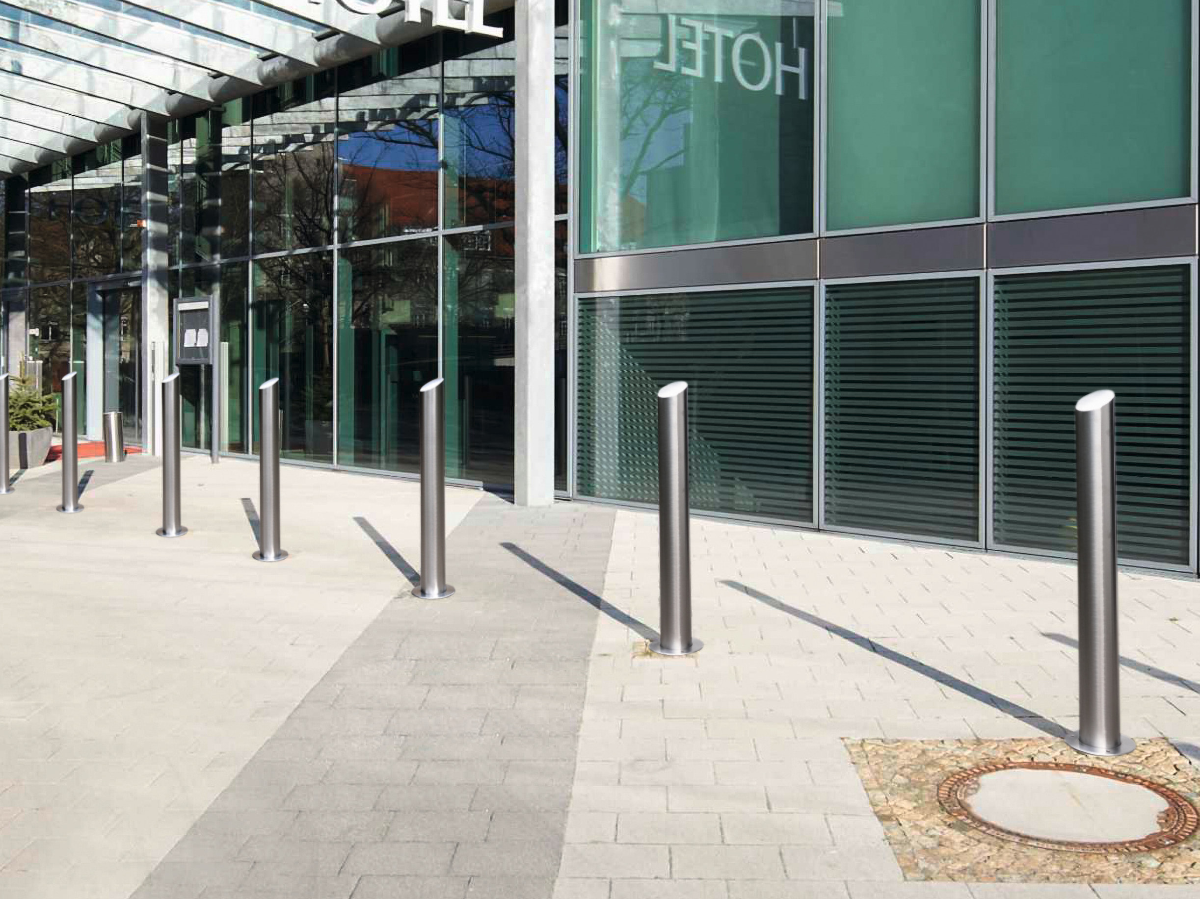 Our bollards are characterised by compact, flexible fitting and can be raised within just 1.5 seconds in an emergency, depending on the model. All cylinders of our Security Line and High Security Line bollards are identical in appearance. In conjunction with matching bottom plates, bollards from both product lines can be ideally combined to obtain a uniform appearance for a building or compound. Due to the identical exterior design of the different bollard versions and their subtle look, they can be harmoniously integrated into an existing overall concept without threatening the cityscape.